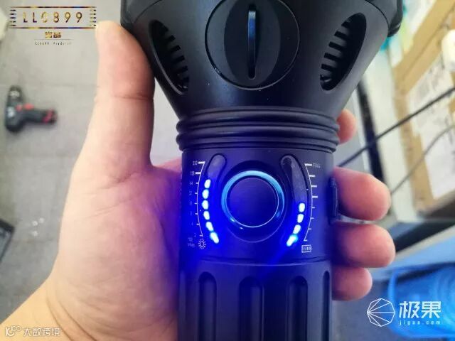 X9R最颠覆的就是开关部分的设计,虽然依旧采用单按键的设计,但是两侧的档位和电量指示美的让人窒息,左侧档位指示,右侧电量指示,分别由8颗蓝色的LED来显示,亮度很高,即使是白天也可以清晰直观的看到档位和电量。