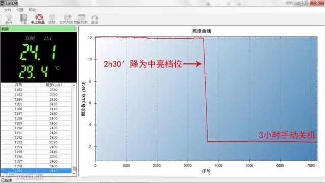 第二小时内,继续水平输出。我手动双击开关,又能提高照度,但是此时照度值明显低于初始状态,1小时29分,指挥家PRO自动降档为高亮档位,此时无法再次开启极亮,黄色指示灯亮起。