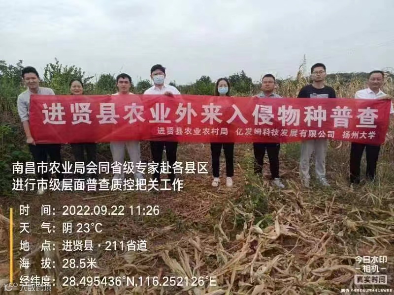 为摸清农业外来入侵物种情况,构建外来入侵物种信息数据库,分析外来入侵物种对经济、生态和社会的影响,研判外来物种入侵扩散趋势,为科学防控外来物种入侵提供基础数据支撑。受进贤县农业农村局委托,江西省亿发姆科技发展有限公司联合扬州大学植物保护学院植物病理研究团队,于2022年7月- 9月,开展农业外来入侵物种调查工作。