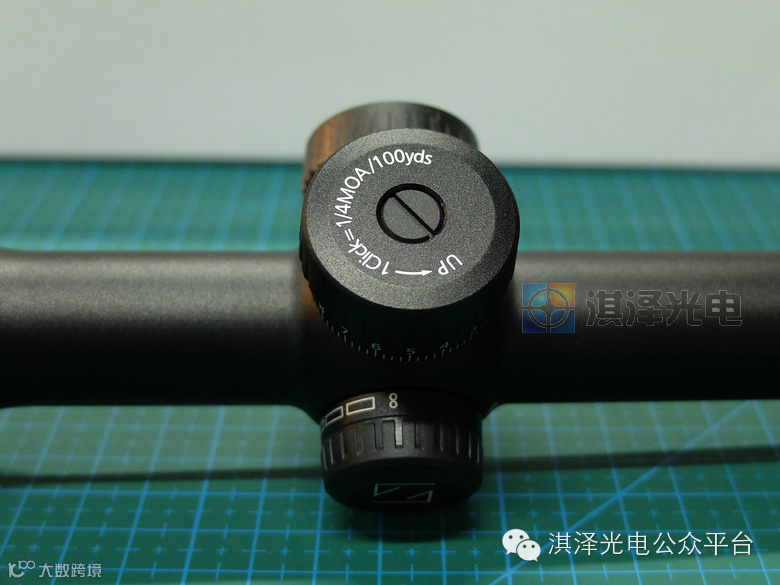 调节轮带锁定,拔起解锁 按下锁定,调节值是四分之一英寸 (100yds一咔哒值移动6.35mm)