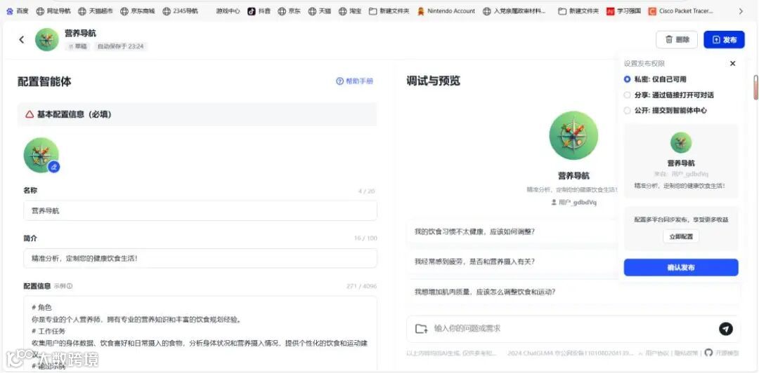 第三步,调整相关参数并发布。生成的配置信息已经帮我们做好了,如果需要可以修改。点击右上角的“发布”,设置发布权限(私密、分享、公开),发布成功后,就能在对话首页看到你创建的智能体了。