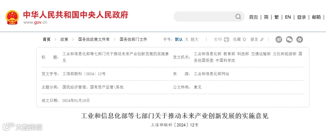 2024年1月,工业和信息化部等七部门联合印发了《关于推动未来产业创新发展的实施意见》,指出大力发展未来产业,是引领科技进步、带动产业升级、培育新质生产力的战略选择。