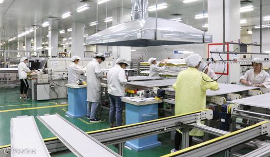工人们穿着整齐的工作服,按照备料、焊接、叠层、层压、装框、清洗、测试、打包等工序,工作人员配合默契、衔接有序的在流水线上繁忙作业。