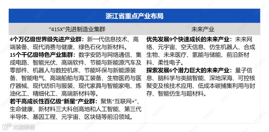 浙江省大力实施“415X”先进制造业集群培育和服务业高质量发展“百千万”工程,扎实推进新型工业化,加快打造数字经济高质量发展强省、现代服务业强省,建设全球先进制造业基地。