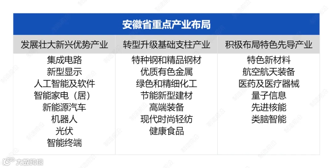 安徽省把打造新兴产业聚集地,突出发展十大新兴产业作为“十四五”时期培育高质量发展新动能的重点任务,围绕“新兴优势、基础支柱、特色先导”三大产业领域,聚力打造优势凸显、基础稳固、特色鲜明的现代产业体系。