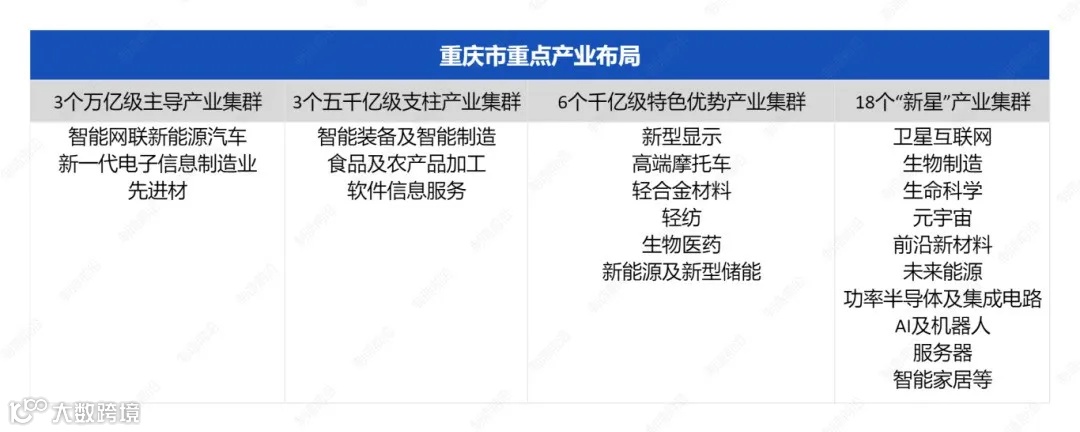 2023年,重庆提出构建“33618”现代制造业集群体系,即推动建设智能网联新能源汽车等3个万亿级产业集群、3个五千亿级产业集群、6个千亿级特色优势产业集群,以及18个“新星”产业集群,全力打造国家重要先进制造业中心。