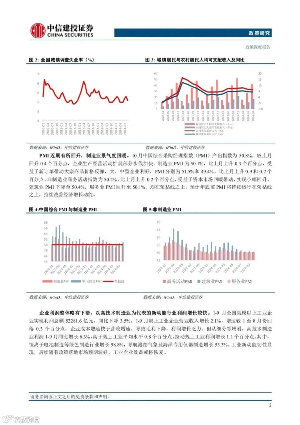 • 实体部门:经济增长呈现复苏态势,结构上向高质量发展转变。前三季度 GDP 增长 4.8%,失业率平稳,居民可支配收入稳定增长,PMI 近期回升,制造业景气度回暖,但企业利润整体略有下滑,高技术制造业利润增长较快。