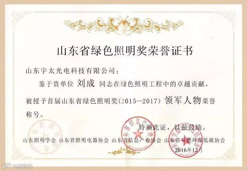 1 12月12日,山东省绿色照明奖颁奖典礼在济南舜耕山庄举行,期间,经过多重选拔,我公司总经理刘成凭借卓越的创新管理能力与先进的管理模式被评选为山东省绿色照明“领军人物”。