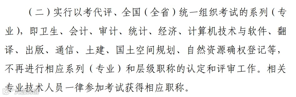 《通知》中重点提到:实行以考代评、全国(全省)统一组织考试的系列(专业),即卫生、会计、审计、统计、经济、计算机技术与软件、翻译、出版、通信、土建、国土空间规划、自然资源确权登记等,不再进行相应系列(专业)和层级职称的认定和评审工作。相关专业技术人员一律参加考试获得相应职称。