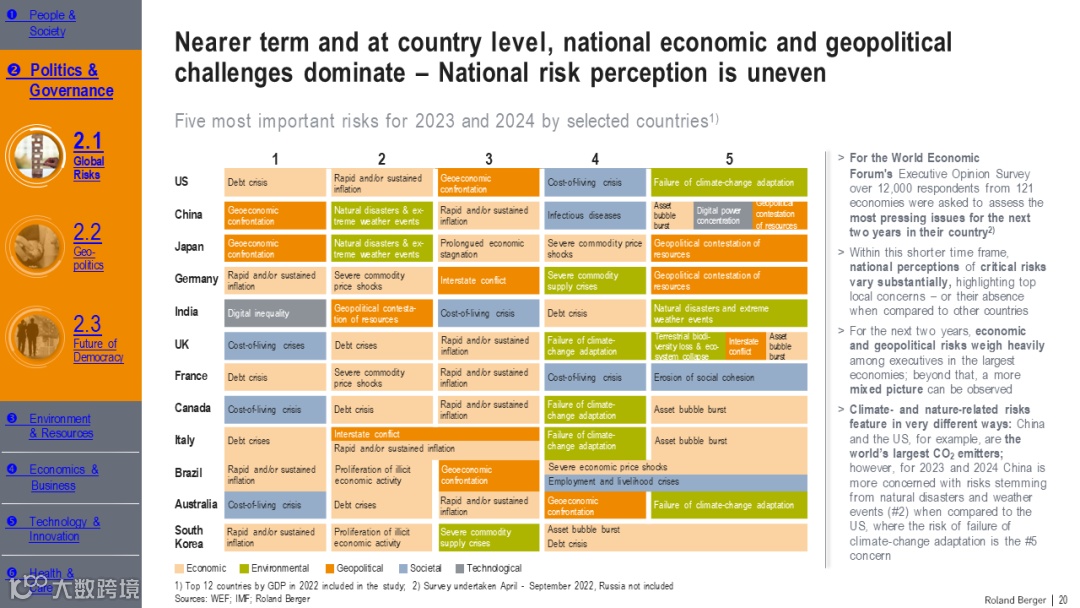 全球风险是指那些可能对全球GDP、人口或自然资源产生重大负面影响的事件或条件。根据世界经济论坛的全球风险报告,环境风险,特别是与气候和自然相关的风险,在长期内占据主导地位。这些风险包括气候变化缓解失败、气候变化适应失败、自然灾害和极端天气事件、生物多样性丧失和生态系统崩溃等。