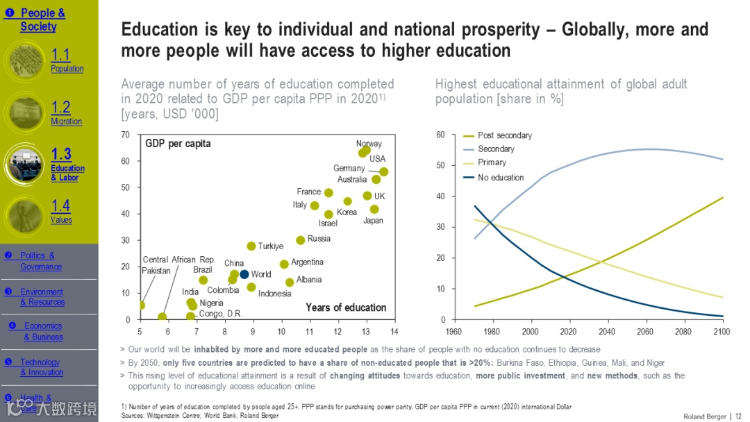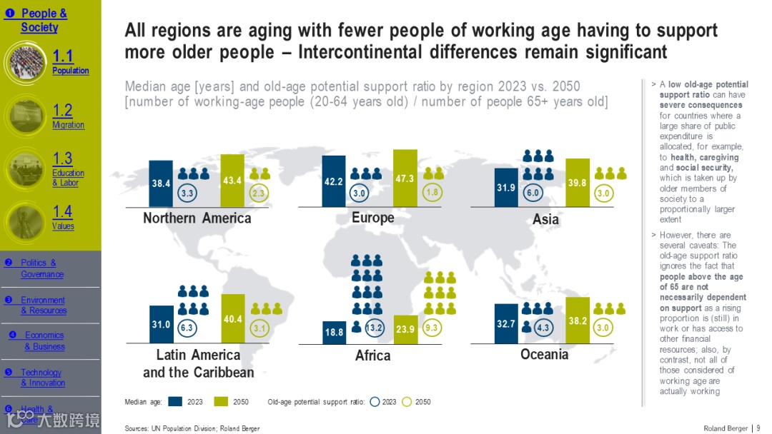 罗兰贝格的《2050年趋势汇编》报告为我们提供了一个深度洞察未来世界的窗口。报告不仅揭示了人口、政治、环境、经济、技术和健康等关键领域的长期趋势,而且强调了这些趋势对全球社会的深远影响。特别引人注目的是,报告指出,尽管短期内全球性事件如疫情和冲突可能引起波动,但长期趋势如技术进步和气候变化的发展方向并未改变。