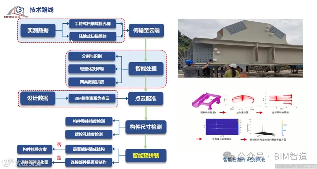 那么,基于BIM模型的预拼装就可以很好地解决这个问题。要实现电脑上的预拼装,首先就需要对生产出来的结构构件进行精确建模(物理构件的数字化),这里就用到了多尺度点云扫描技术。多尺度点云扫描采集构件数据,是通过陆地式扫描仪扫描构件的整体尺寸,局部细节采用手持式扫描仪扫描螺栓孔细部尺寸。通过统一坐标系将不同精细度的模型整合成完整构件,然后在电脑中进行虚拟拼装。同时,我们也需要把设计BIM模型和扫描的点云模型进行拟合对比,实现设计——制造——建造的一体化。