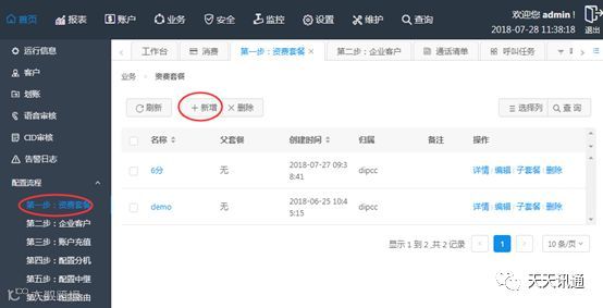 点击首页的配置流程第一步创建一项资费套餐,在跳转页面选择新增,即可新增一项资费套餐。