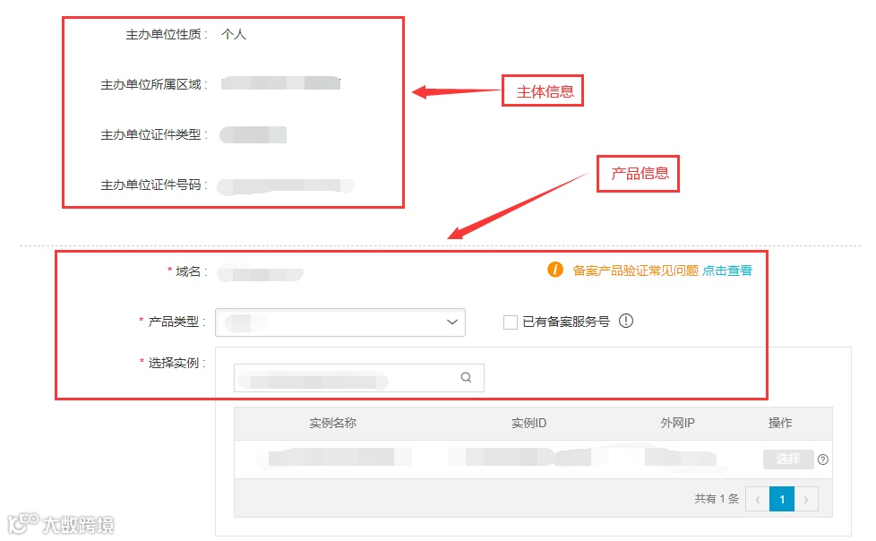 确认上述填写的备案主体信息是否正确,以及选择备案产品信息。