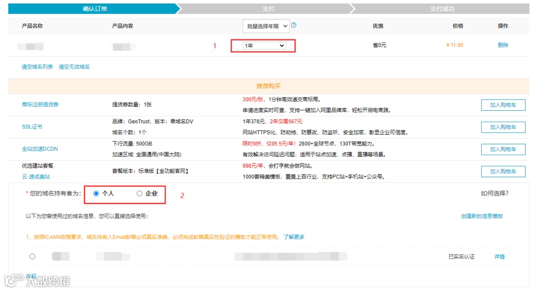 若有创建持有者信息,可直接选择,否则需先创建域名注册信息模板,并做实名认证。