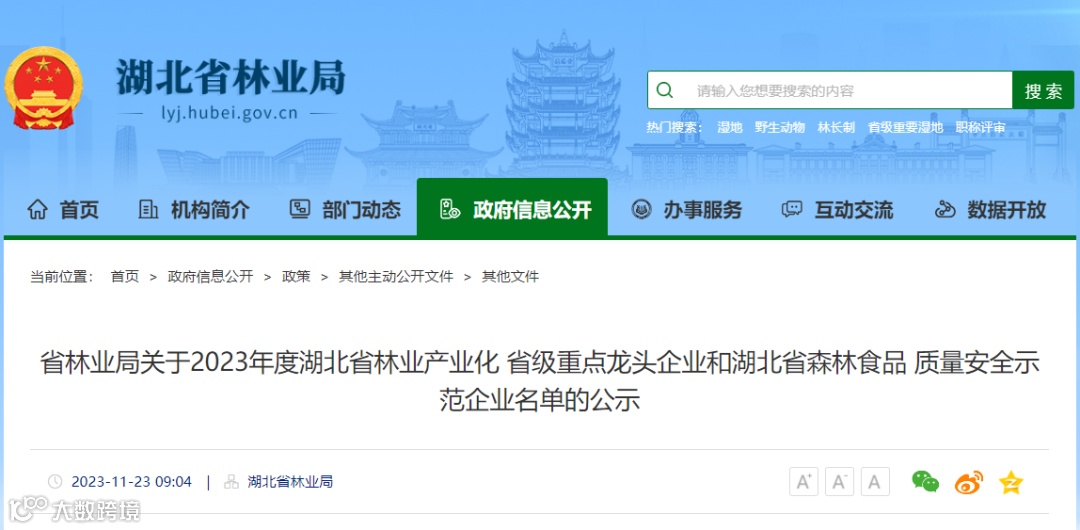 近日,湖北省林业局公布了2023年度湖北省林业产业化省级重点龙头企业和湖北省森林食品质量安全示范企业名单,其中湖北天勤生物科技有限公司被认定为”2023年度林业产业化省级重点龙头企业“。