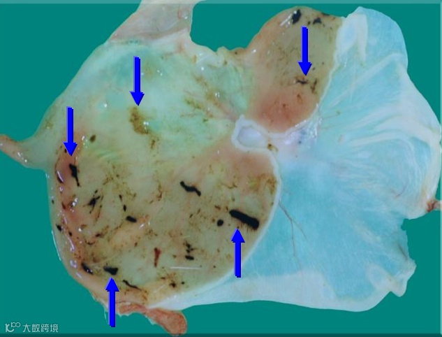 犬经颈静脉连续滴注生理盐水9小时后可发生多灶性心脏出血。