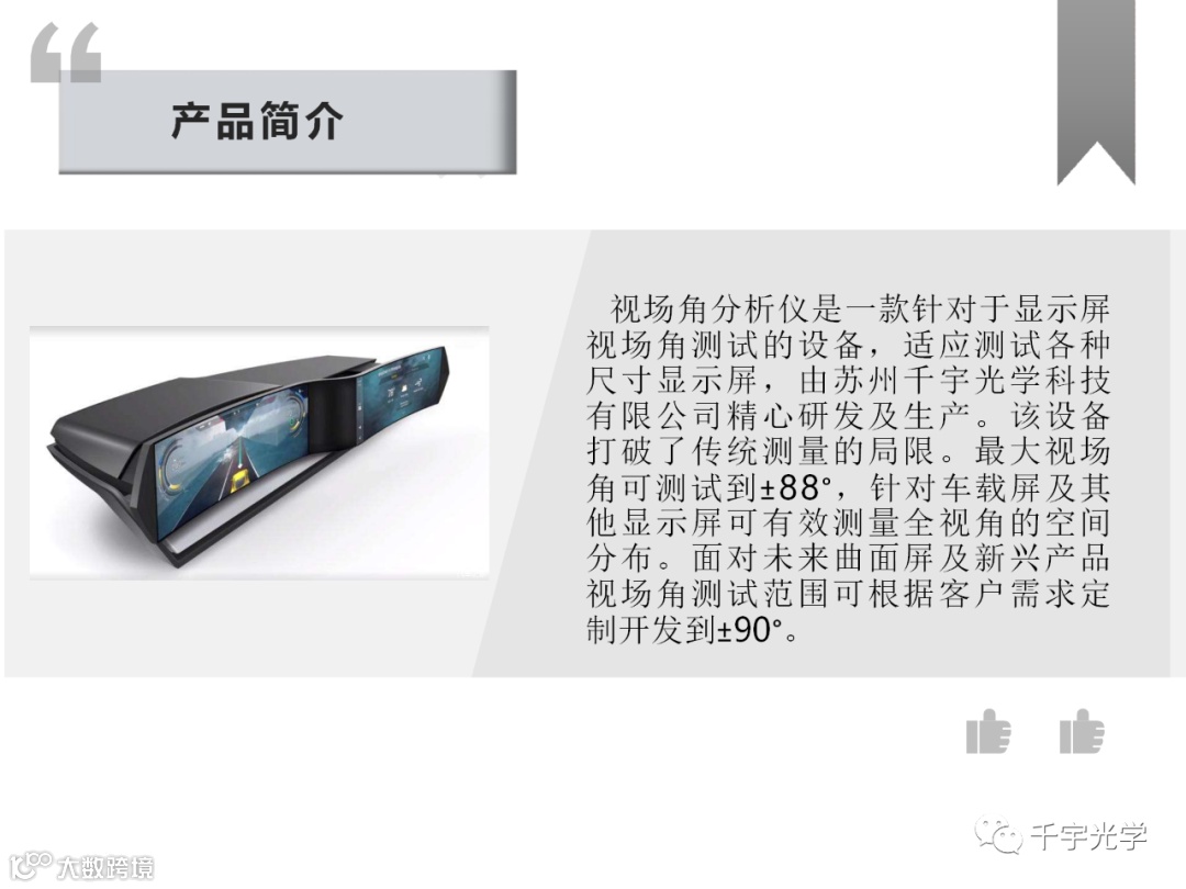 苏州千宇光学科技有限公司自主研发了VAM-88视场角测试仪,最大视场角可测试到±88°,针对车载屏及其他显示屏可有效测量全视角的空间分布。面对未来曲面屏及新兴产品视场角测试范围可根据客户需求定制开发到±90°。