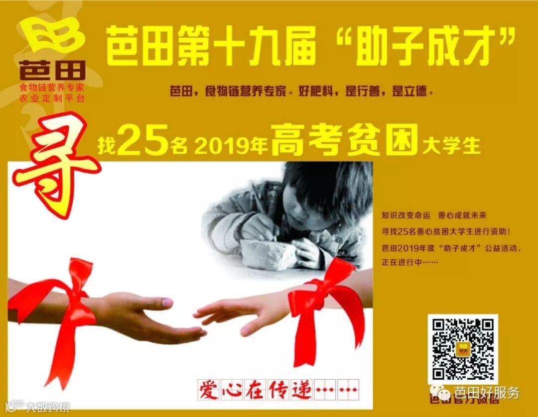 (2)关注“芭田好肥料”或者“芭田好服务”微信公众号,回复“助子成才”下载《芭田健康新使命第十九届“助子成才”助学金申请表》填写完毕后交由芭田工作人员、当地芭田经销商、零售店或寄回芭田公司;亦可拍照申请表上传至“芭田好肥料”或者“芭田好服务”微信公众号。