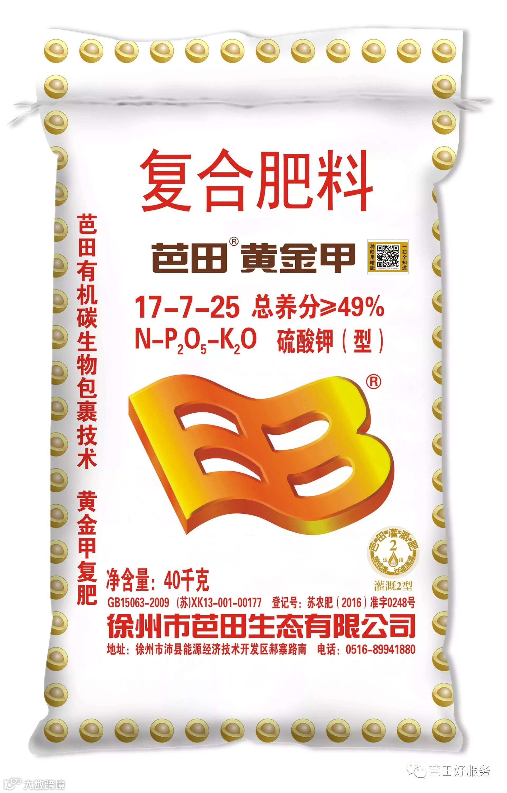 提苗壮根用芭田黄金甲复肥(17-7-25)效果非常好,芭田黄金甲复肥(17-7-25)有机络合营养,特有的有机碳专利技术能减缓钾的淋湿及磷未被吸收完而固化于土壤,有效提高钾、磷的有效利用率10%左右。