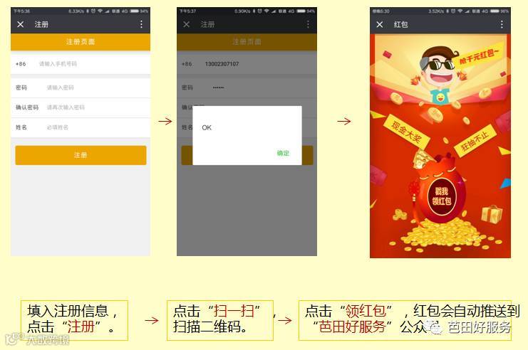 注册成功后,会自动跳入领红包界面,点击“领红包”,红包会自动推送到“芭田好服务”公众号。