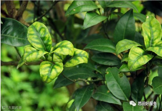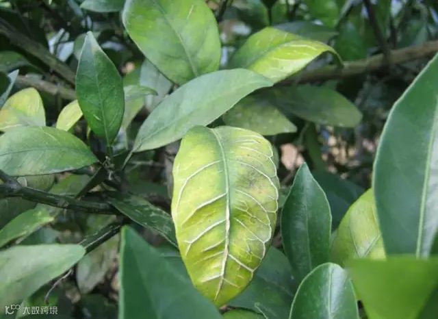 成熟叶的叶片黄化,叶脉木栓化、甚至爆裂。春季时柑橘卷叶,特别是老叶反卷时,多与缺硼有关。
