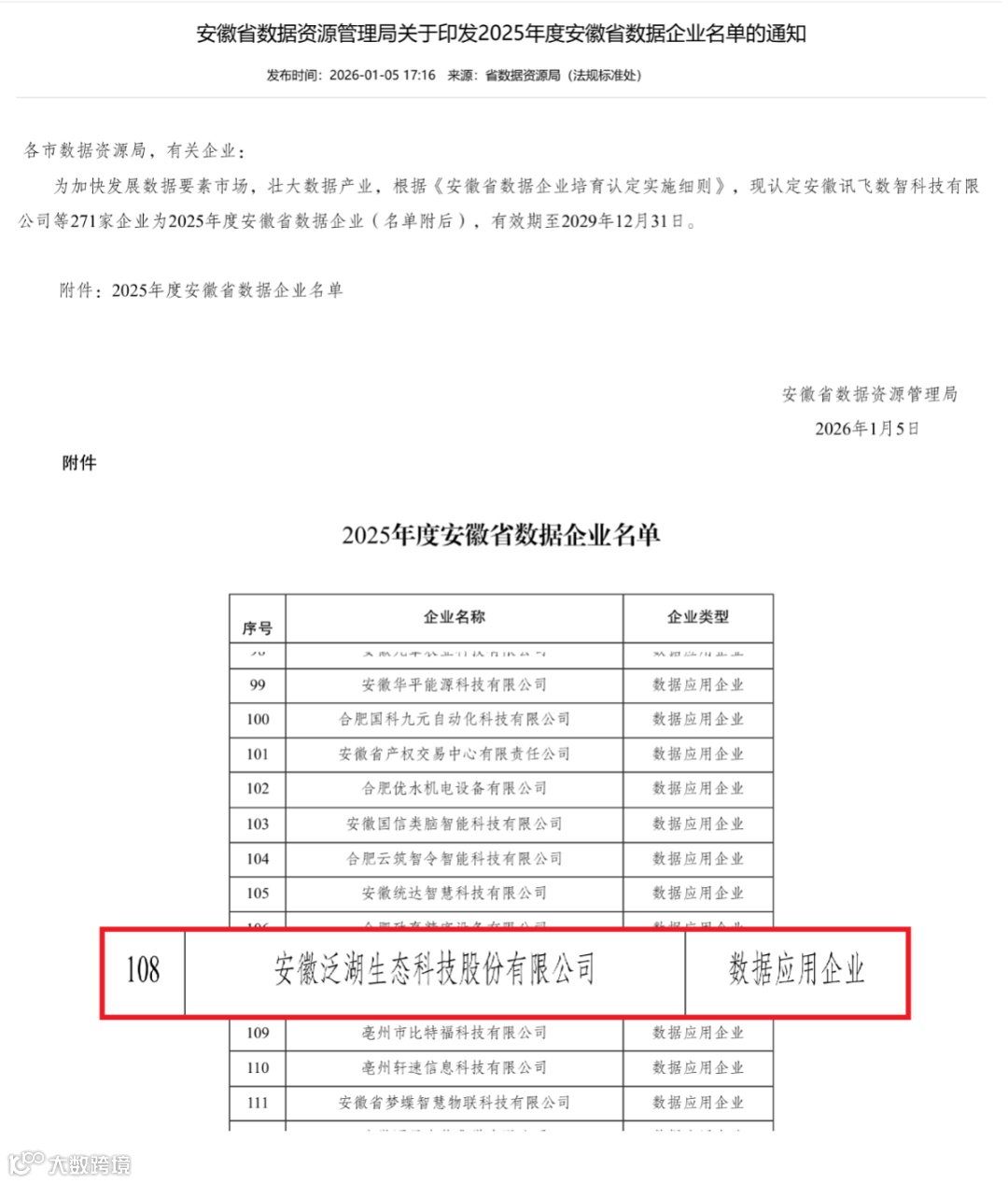 2026新年伊始,再传喜讯,泛湖生态正式荣获 “安徽省数据企业” 称号。