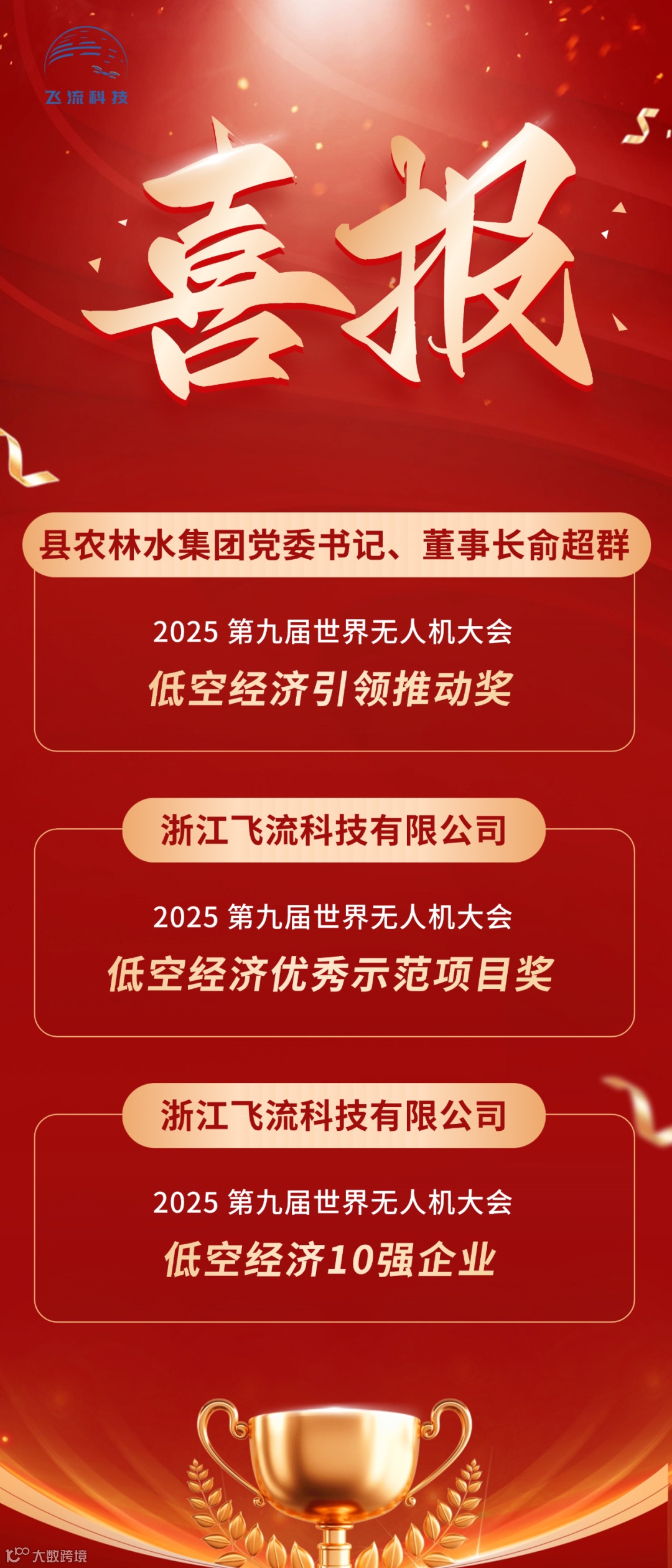 会上,2025第九届世界无人机大会组委会、深圳市无人机行业协会授予新昌县农林水投资发展集团有限公司党委书记、董事长俞超群“低空经济引领推动奖”,集团下属全资子公司浙江飞流科技有限公司继昨日获得“低空经济优秀示范项目奖”后,今日再次获评“低空经济10强企业”,获奖数量在本次大会位列第一。