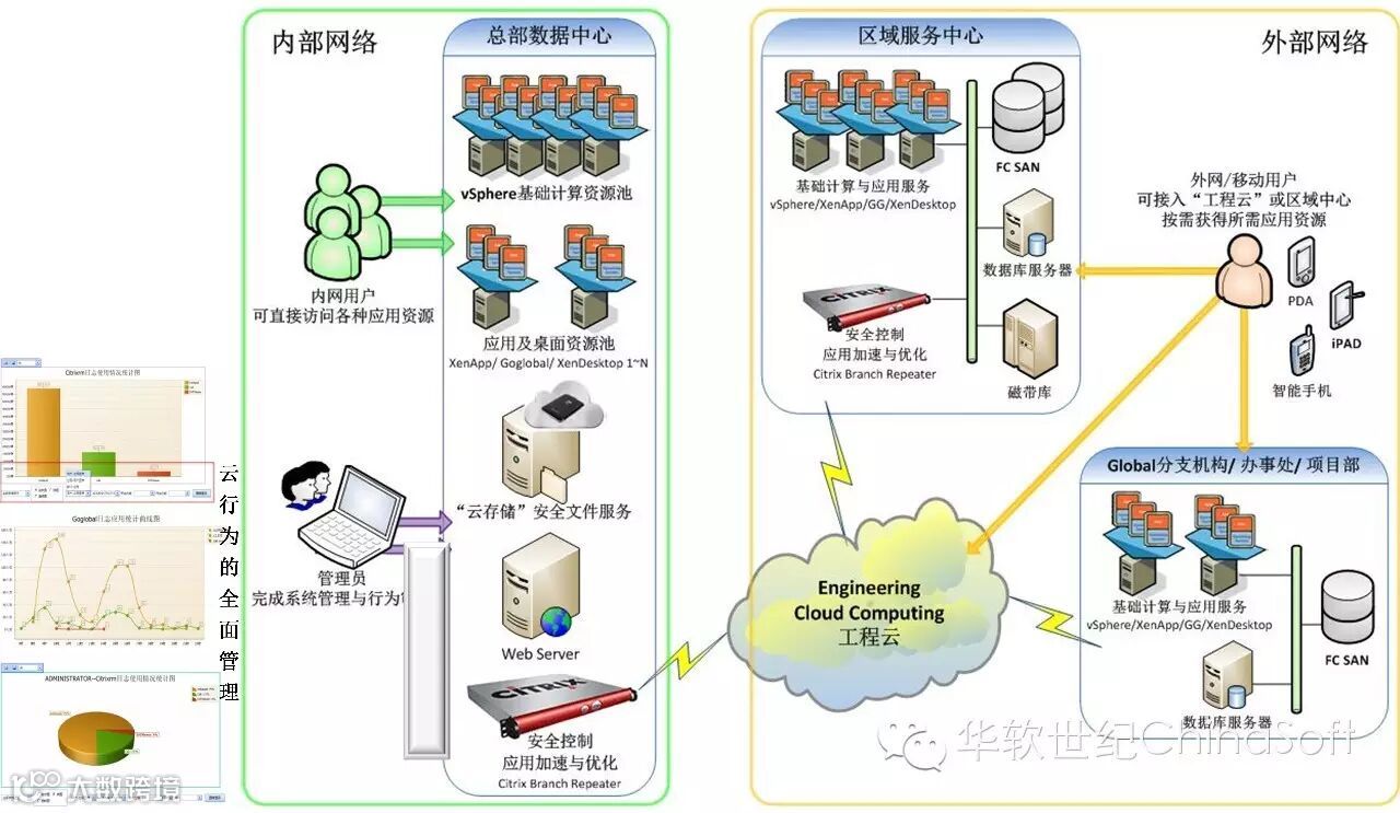 为了实现以上目标,HQC对国际流行的先进软硬件技术和应用模式进行了深入研究,将成熟的虚拟化及“私有云”技术与工程公司现有需求紧密结合,融合已经成功运行多年的服务器虚拟化和应用程序虚拟化的实施经验,根据大型工程公司经营、管理模式,借鉴虚拟化技术在国内外工程企业中的成功应用,在现有IT基础架构之上,通过调整服务器资源、网络资源、应用资源等的配置,提出对HQC“工程云”平台的建设规划,并进行了分步实施。