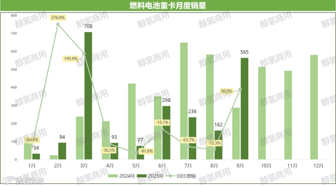 调整期:2-8月间,除2月(94辆,同比增276.0%)外,4-8月均出现同比下滑,其中5月同比降幅达81.8%,8月降幅72.3%。这一阶段的调整,反映出市场在技术迭代、成本控制与商业化推广中的阶段性阵痛,也侧面体现了行业从政策驱动向市场驱动的转型过程。