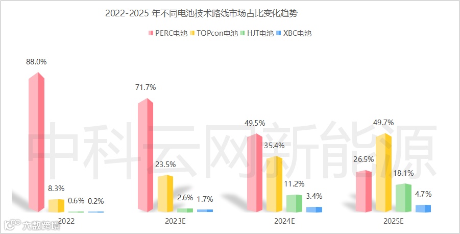 CPIA在《2022-2023年中国光伏产业发展路线图》中指出:“新投产的量产产线仍以 PERC 电池产线为主。但下半年部分 n 型电池片产能陆续释放,PERC 电池片市场占比下降至 88%,n 型电池片占比合计达到约 9.1%,其中 n 型 TOPCon电池片市场占比约 8.3%,异质结电池片市场占比约 0.6%,XBC 电池片市场占比约 0.2%。由于部分海外市场如印度、巴西等国家仍对成本低廉的 BSF 产品有需求,国内一些细分市场如太阳能路灯等产品在使用,2022年BSF电池片市场占比约 2.5%。”