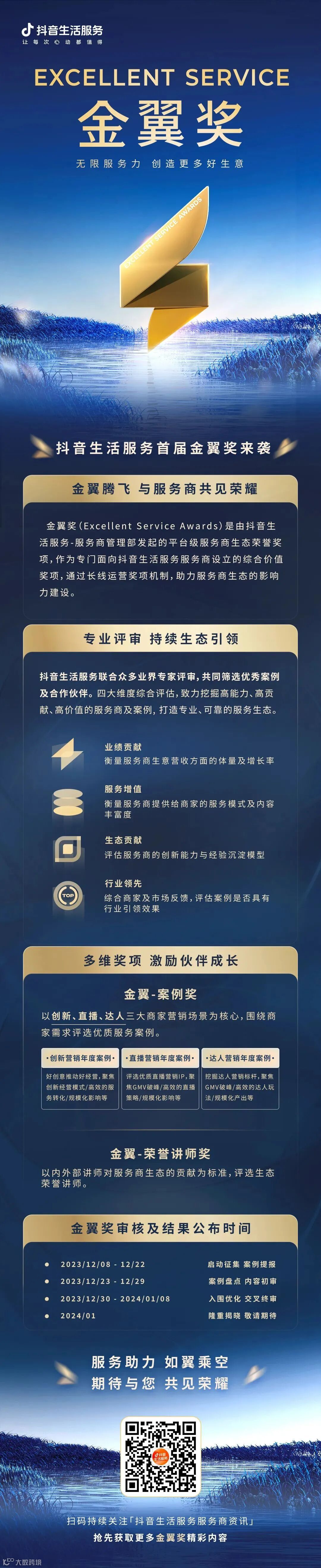 无限服务力,创造更多好生意。金翼奖将致力于链接更多优质服务商,激发抖音生活服务平台生态的活力。向服务商全情付出致敬,期待与服务商共见荣耀!