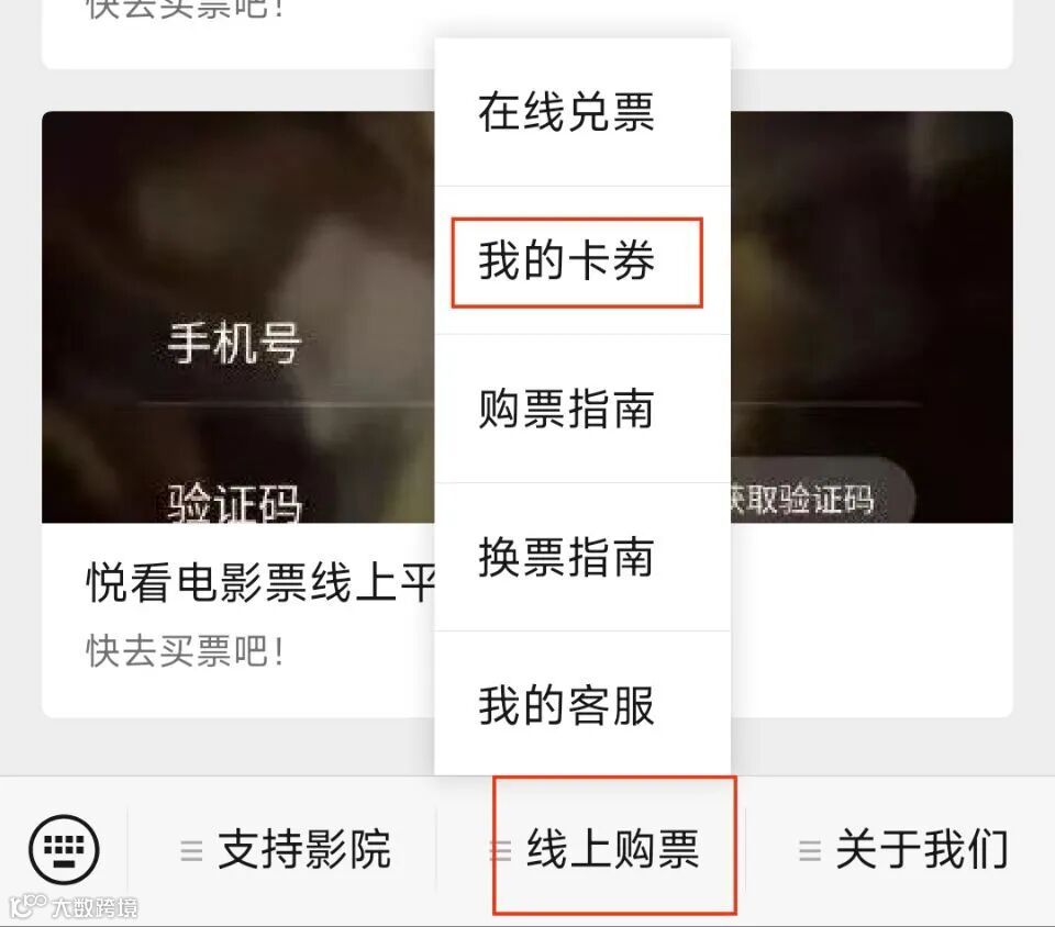 点击【线上购票】,【我的卡券】进入绑定界面,输入手机号及验证码,绑定手机。