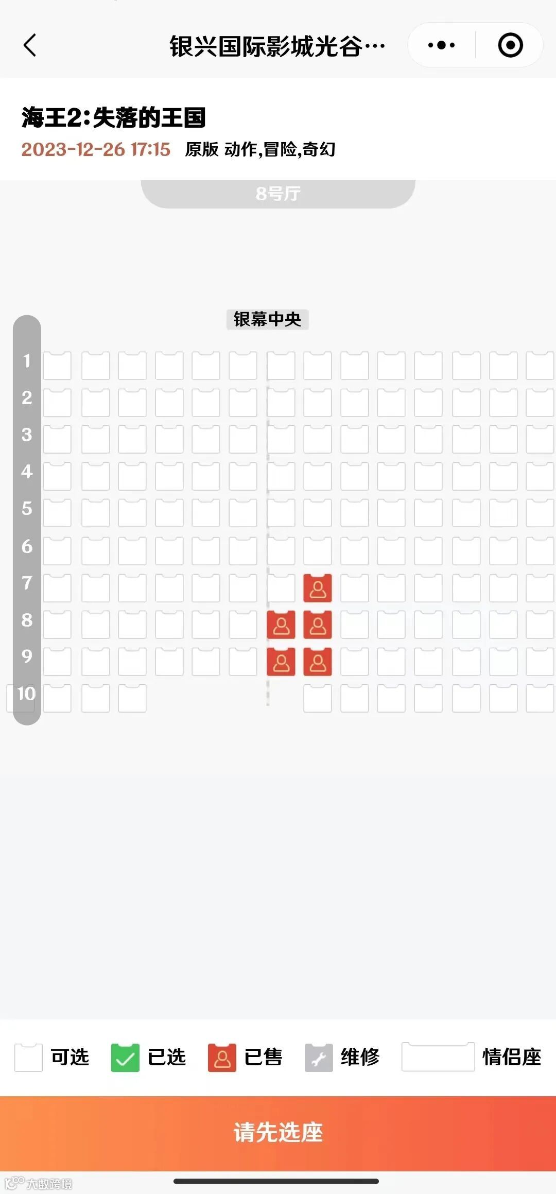 进入【影院】界面,选择您想看的场次及时间,点击【选座】,进入选座界面,选择空白的座位,绿色即选座成功。