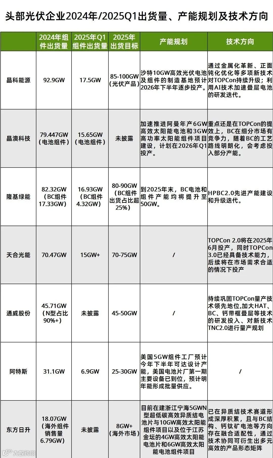 行业洗牌加剧,跨界企业加速退出,市场份额向具备规模、技术、成本优势的龙头集中。例如,晶科能源2024 年组件出货 92.9GW,2025 年目标 85-100GW,凭借 TOPCon 技术领先与海外布局巩固地位;隆基绿能BC 组件出货 17.33GW(同比 + 191%),计划 2025 年 BC 产能提升至 50GW,抢占分布式市场高地。