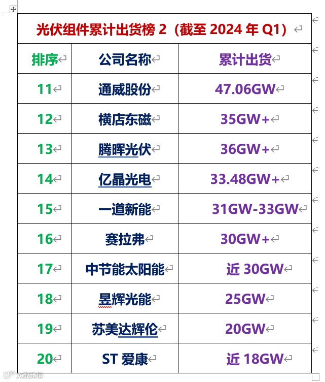累计出货量排名第八的是协鑫集成,出货量为60-61GW,排名第九是的英利能源,累计出货量为58GW,通威股份排名第十,累计出货量为57.73GW。通威股份于2022年正式进入组件环节,近年出货势头迅猛,2024年H1出货18.67GW,超过了“千年老五”阿特斯的位置,位于全球组件出货Top位置。
