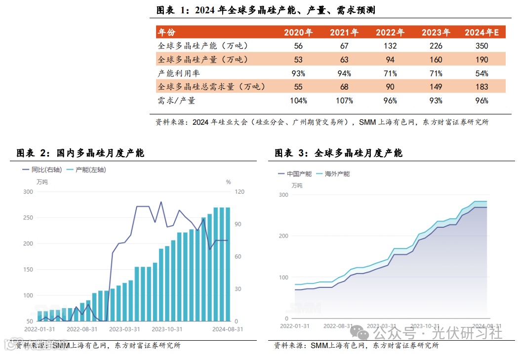 未来一年名义产能显著过剩,关注当前价格水平下的实际盈利和产量变化更有意义。根据硅业分会数据,2024 年上半年国内多晶硅产能达到 246 万吨。根据 SMM 数据,2024 年 8 月国内产能达到 269 万吨,海外产能 14.4 万吨。硅业分会预计 2024 年末国内多晶硅产能约 336 万吨,叠加海外约 14 万吨产能,全球产能有望达 350 万吨。