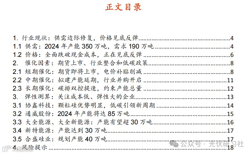 短期催化:期货即将上市,电价补贴削减。当前行业库存在 30 万吨左右。我们估算,若按每个存放点 5000 吨计算,期货交割库最低保障库容在 10 万吨左右,可阶段性消化行业库存,提振行业价格。从成本看,工业硅期货 2024 年11月和 12 月价差约 3000 元,预示市场对 12 月价格乐观。地方政府逐步落实取消优惠电价,以电力市场化替代价格补贴,电力价格短期上行,支撑多晶硅成本。