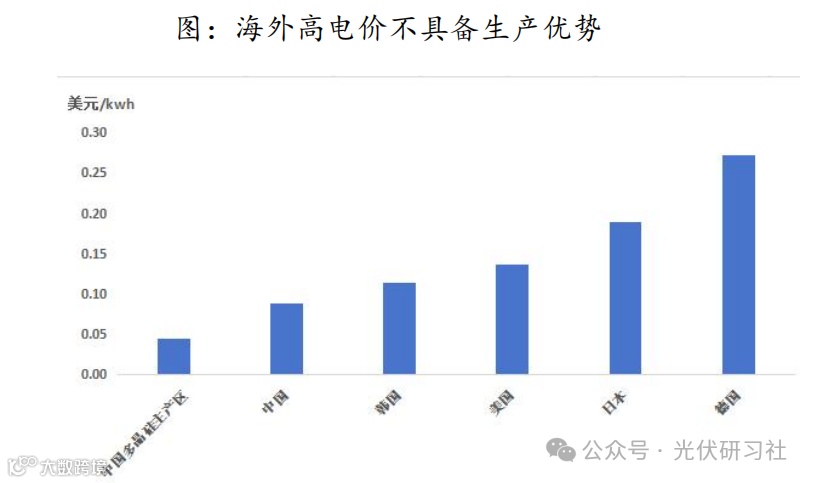 (2)在电力成本方面,我国企业的平均电价相对较低。据 GlobalPetrolPrices 数据显示,我国企业的平均电价仅为美国的 65%。此外,我国多晶硅的主要产区位于电力资源丰富的西北及西南地区,这些地区的平均电价大约为 0.045 美元/kwh(以 2023 年 12 月的人民币汇率进行换算),相当于美国企业电价的 32.8%,以及多晶硅生产国中电价最低的韩国的39%。根据 2023 年国内多晶硅生产平均电耗 57kWh/kg 估算,韩国多晶硅的电力成本每千克比中国高出约 4 美元,而美国多晶硅的电力成本每千克比中国高出约 5.2 美元。