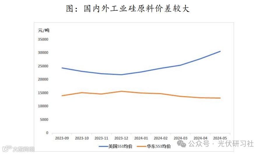 (1)在工业硅原料成本方面,我国作为工业硅的最大的生产国,具有较为明显的价格优势,以 2023 年 12 月价格为例,根据 SMM 数据进行汇率换算,美国 553 硅均价约为 21860.5元/吨,而华东通氧 553 均价仅为美国 553 均价的 71%,再按照国内工业硅块与硅粉之间 150元/吨左右的价差进行计算,在美国生产每吨多晶硅的成本较中国高出约 6761.4 元。