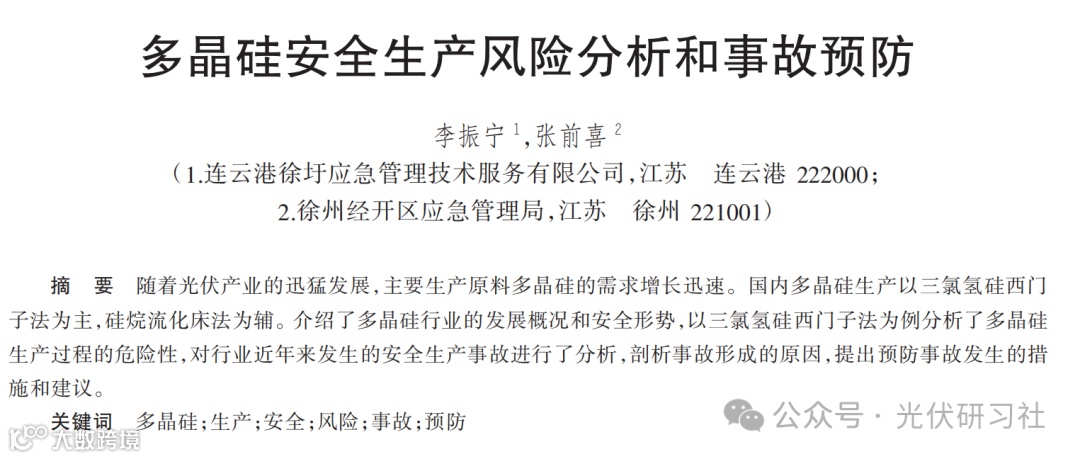 加强对有关中间产品、副产品危险特性和工艺过程风险的认识,完善防泄漏、防爆、防静电措施,严格变更、检维修、特殊作业安全、重大危险源的管理。在生产过程中,需要重点关注开停车过程管理,在运行过程中的生产精馏、冷氢化工艺自动化控制,氯硅烷储存管控,氯硅烷、氯气、氢气防泄漏,硅粉防爆管理。而对多晶硅产业快速发展的中西部地区,要严把多晶硅生产企业新、改、扩建项目安全审查关,委托有资质的设计单位进行设计,从源头提升本质安全水平,防范遏制安全生产事故。
