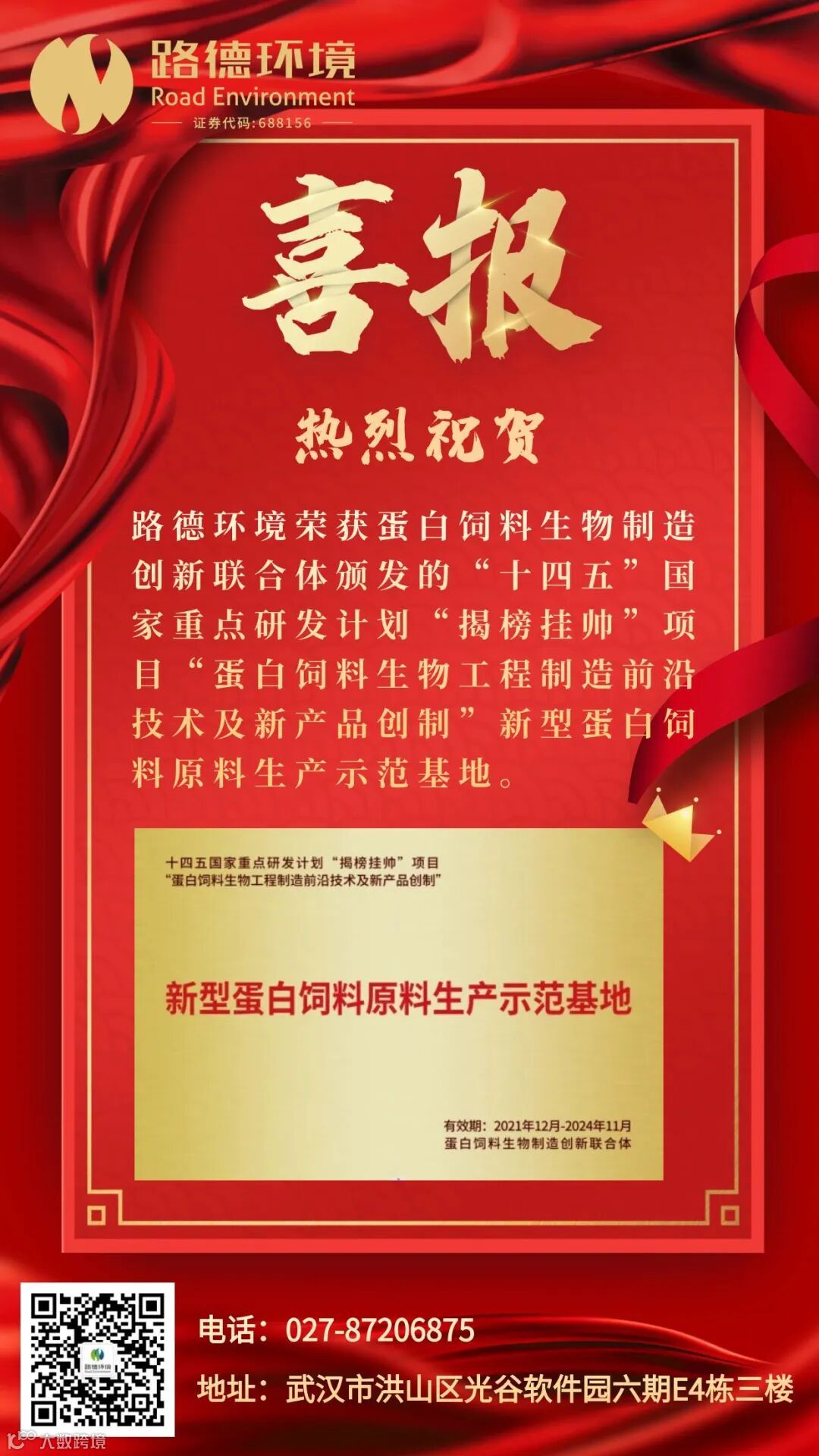 【路德·喜报】路德环境荣获蛋白饲料生物制造创新联合体颁发“新型蛋白饲料原料生产示范基地”