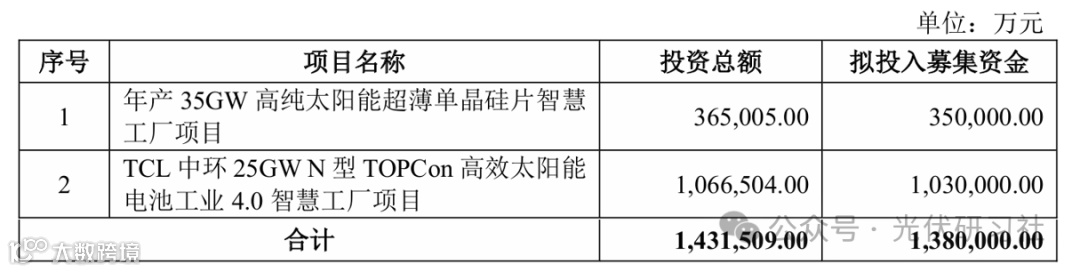 5月15日,TCL中环发布募集说明书(申报稿),说明书显示,TCL中环拟通过可转债发行集资金总额不超过138亿元。其中35亿元,用于年产35GW高纯太阳能超薄单晶硅片智慧工厂项目;103亿元用于TCL中环25GWN型TOPCon高效太阳能电池工业4.0智慧工厂项目。