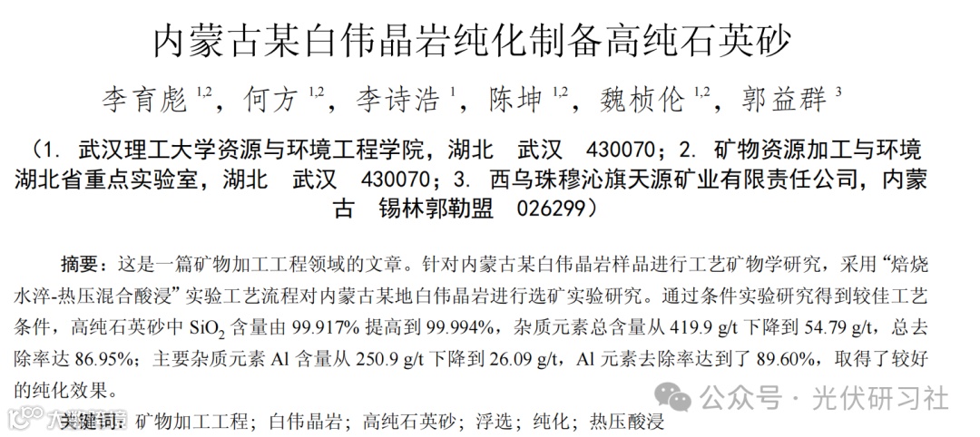 本文针对内蒙古某白伟晶岩石英矿,采用光学显微镜、X射线衍射、电感耦合等离子发射光谱仪(ICP-MS)等测试技术方法对白伟晶岩进行系统的工艺矿物学,探究石英砂中的杂质赋存状态。然后采用焙烧水淬-化学酸浸工艺对白伟晶岩石英砂纯化制备高纯石英砂。