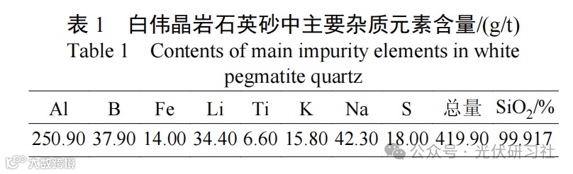 (1)采用透反两用偏光显微镜、ICP、XRD等对内蒙古某白伟晶岩进行工艺矿物学研究,结果表明:原矿中SiO2含量为99.917%,主要杂质元素为Al、Fe、K、Na、Li、Ti、S、B等,赋存于石英-白云母连生体以及石英晶格之中。