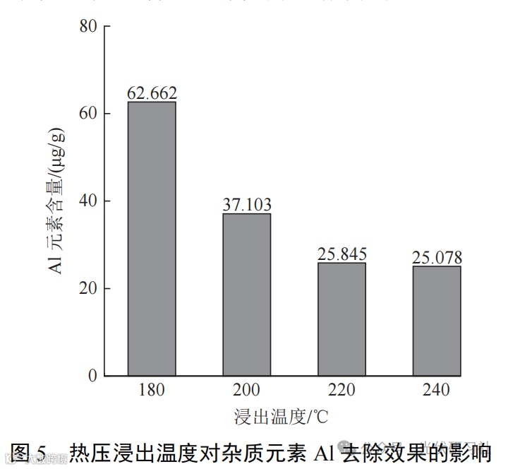 由图4可知,焙烧温度从700℃增加至900℃,杂质元素Al含量从76.429g/t降低至62.662g/t,去除率从69.54%提升至75.02%。但是,焙烧温度从900℃继续升高至1000℃,Al元素含量增加至65.339g/t。因此,确定较佳焙烧温度为900℃。