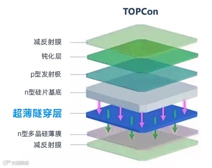 TOPCon电池核心流程就是制作隧穿氧化层、多晶硅层环节部分,制备隧穿氧化层与多晶硅层环节是在N型硅片的背面沉积一层1-2nm的氧化硅膜和一层100-150nm的掺杂非晶硅薄膜,非晶硅薄膜在后续退火过程中结晶性发生变化,由微晶非晶混合相转变为多晶,激活叠层薄膜的钝化性能,在叠层薄膜上沉积金属,就可以得到无需开孔的钝化接触结构。