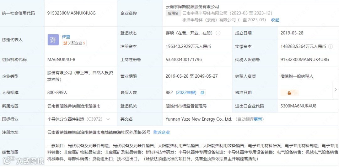 公开资料显示,宇泽新能曾用名为云南宇泽半导体,于2019年5月成立,法定代表人为许堃,注册资本约为15.63亿元。该公司控股股东为