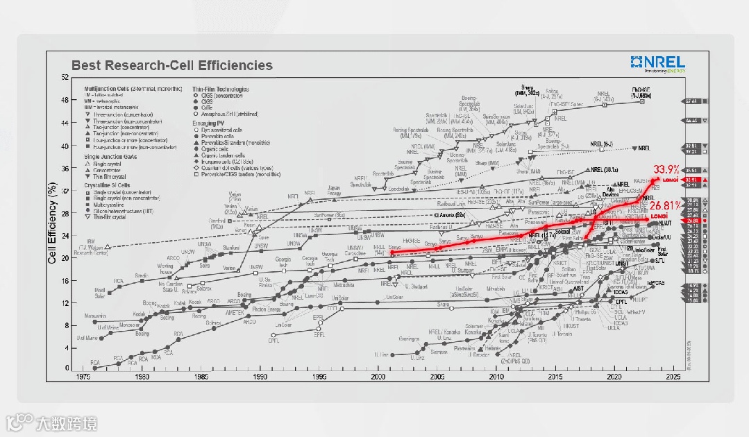 ■ 美国国家可再生能源实验室(NREL)发布《太阳电池最高研究效率图》,收录隆基绿能晶硅单结电池(26.81%)和晶硅-钙钛矿叠层电池(33.9%)两大赛道电池效率世界纪录。