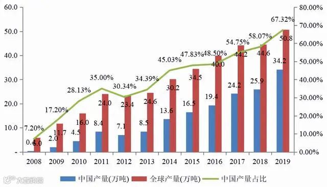 图4:2008-2019年中国多晶硅产量及占全球产量的比重,资料来源:中国光伏行业协会,新疆大全招股书